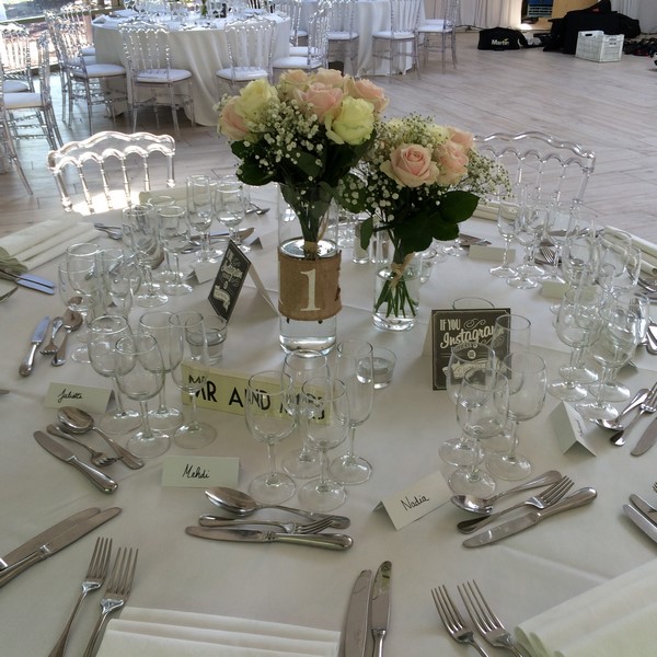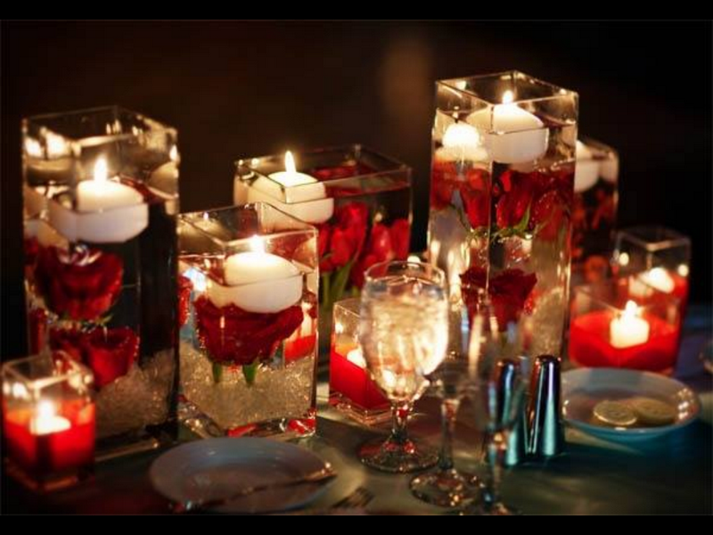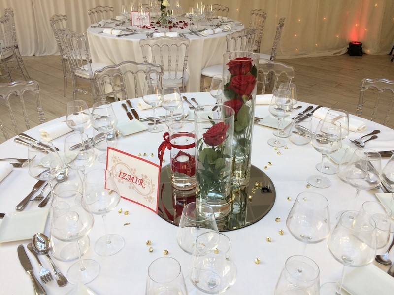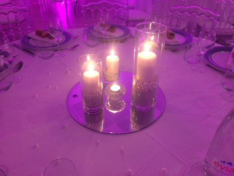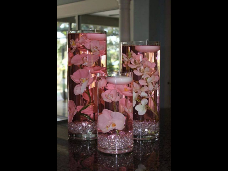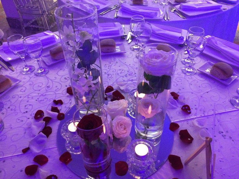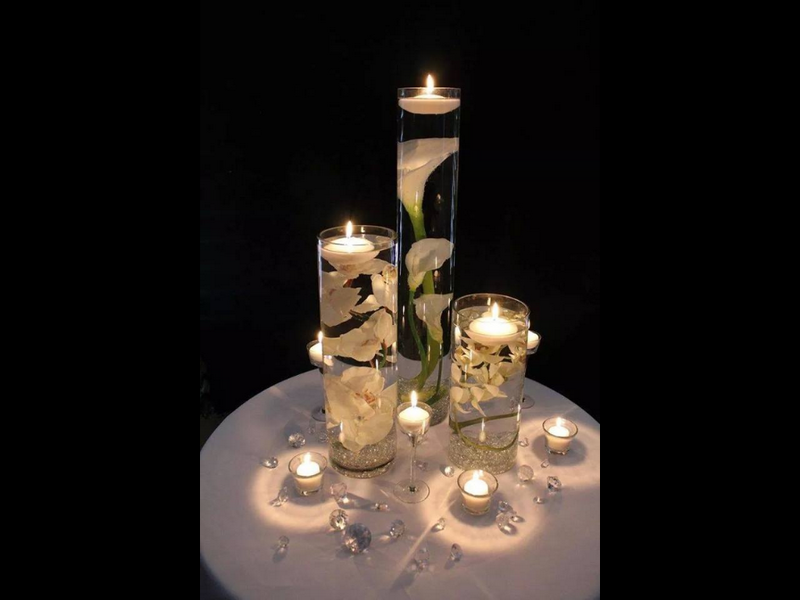 Trois vases tube de différentes hauteurs composés de fleurs et bougies à votre convenance
